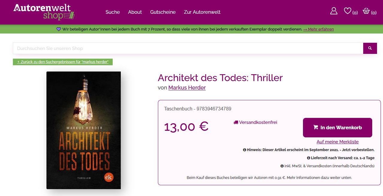 Als mir gestern ein Freund einen ScreenShot von Architekt des Todes geschickt, blickte ich ein wenig ungläubig auf meinen Bildschirm. Natürlich wusste ich von meiner Lektorin, dass das Buch gelistet und somit überall bestellbar war. Doch in dem Moment, als ich das Cover mit meinem Namen auf der bekannten Website sah, wurde mir klar, dass ich ab jetzt auch offiziell Autor war. Ein komisches Gefühl, aber auch ein saucooles. 🙂